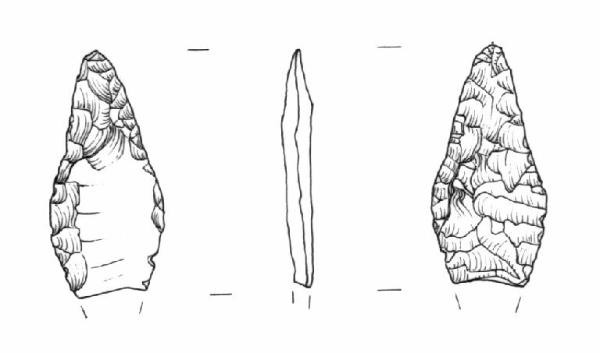Punta foliata peduncolata semplice, ritocco coprente bifacciale. Margini rettilinei irregolari, peduncolo a profilo subtrapezoidale. Sezione biconvessa.