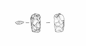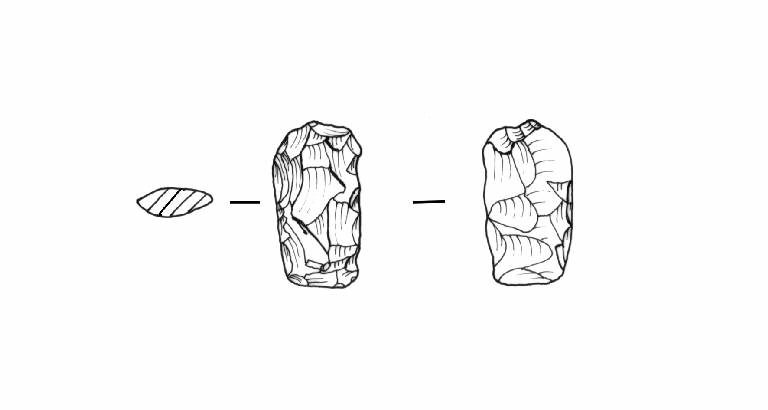 Raschiatoio foliato multiplo, ritocco coprente sommario, bifacciale. Margine inferiore rettilineo, margini laterali rettilinei leggermente convergenti al basso, margine superiore convesso. Sezione biconvessa.