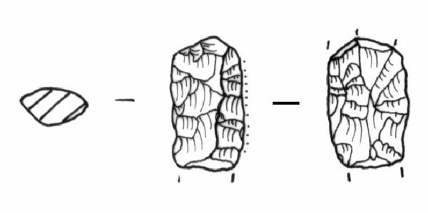 Raschiatoio foliato multiplo, ritocco coprente, bifacciale. Margine superiore convesso, margini laterali rettilinei. Sezione bombata.