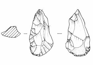Raschiatoio foliato doppio, ritocco coprente, bifacciale. Margine inferiore convesso, margini laterali irregolari, margine superiore convesso. Sezione irregolare.