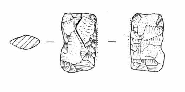 Raschiatoio foliato multiplo, ritocco coprente, bifacciale. Margine inferiore e superiore rettilinei, margine destro rettilineo e sinistro irregolare. Sezione piano-convessa.