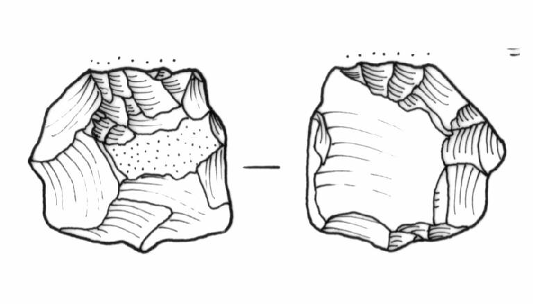 Raschiatoio foliato semplice, ritocco invadente, bifacciale. Margini irregolari, profilo subquadrangolare.