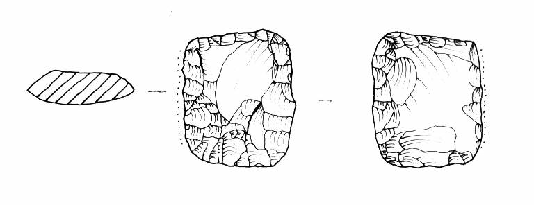 Raschiatoio foliato multiplo, ritocco invadente, bifacciale. Margine inferiore e superiore e laterali rettilinei di ugual misura. Sezione biconvessa.