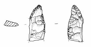 Ritocco piatto, coprente, bifacciale. Margine destro convesso/concavo verso la punta, porzione superiore del margine sinistro convessa, punta a margini convessi. Sezione piano-convessa.