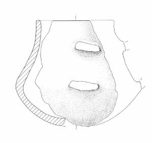 Biconico-globoso, orlo diritto, conserva gli attacchi dell'ansa lungo il diametro massimo e sotto il collo.