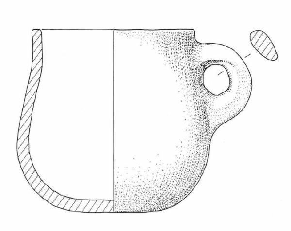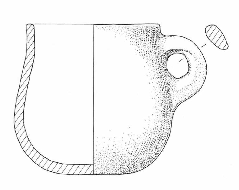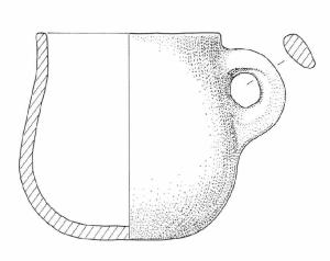 Globoso con ansa ad anello impostata sotto il labbro, labbro lievemente esoverso, fondo piano, diametro massiomo a 1/3 dell'altezza.