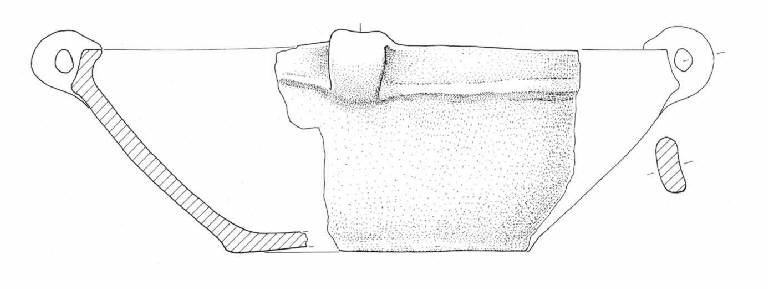 Troncoconico con quattro anse ad anello, labbro rientrante sottolineato da una nervatura.