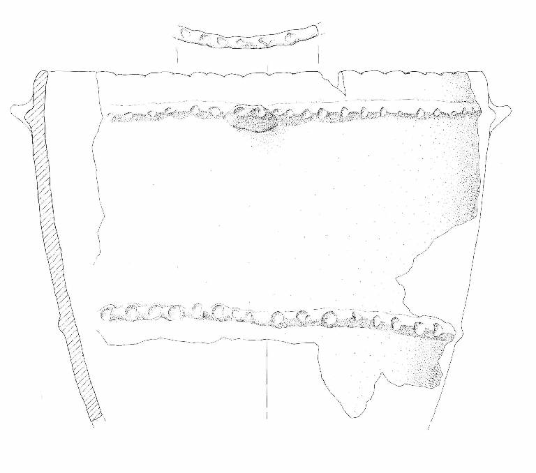 Troncoconico con orlo e cordoni plastici decorati ad impressioni di polpastrello. Presa a linguetta sul cordone presso il labbro.