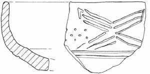 Con carebìna accennata, decorata lungo il diamentro massimo da due linee incise, sul labbro da due fasci di linee inctociati a incisione e puntini.
