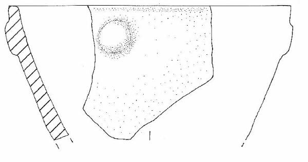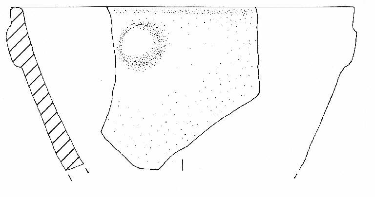 parete rettilinea, labbro diritto, orlo piatto. Una bugna a pastiglia piatta è applicata in prossimità dell'orlo