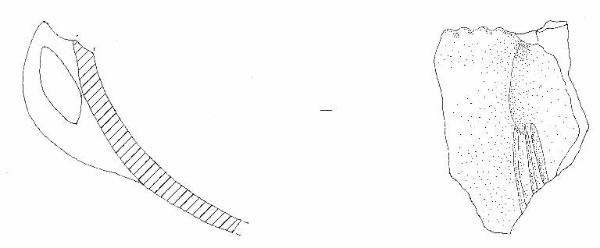 Parete convessa, decorata da tre solcature parallele verticali presso l'attacco onferiore dell'ansa. Ansa a gomito con apice ondulato.