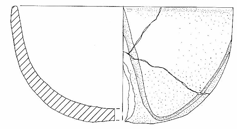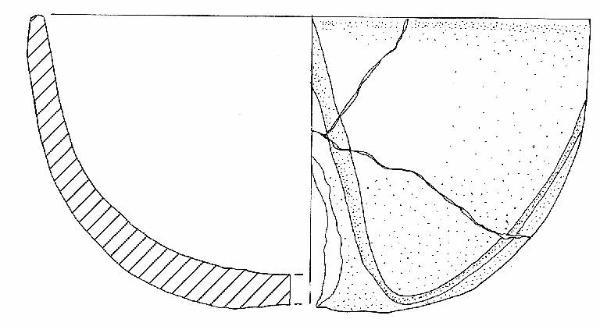 Parete convessa decorata da due solcature parallele oblique ad andamento lievemente curvilineo, orlo ingrossato piano a tacche