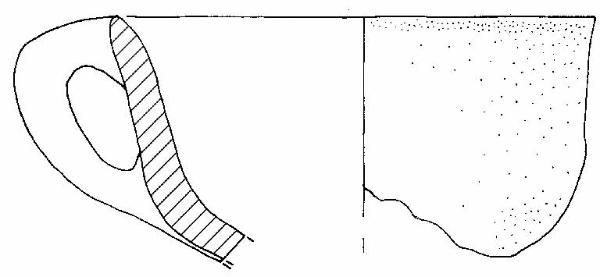 Vasca convessa bassa, parte superiore rettilinea esoversa, ansa a nastro impostata sull'orlo