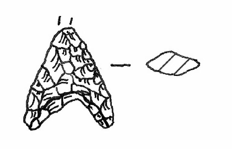 Ritocco piatto, coprente, foliato. A base concava con alette uguali e divergenti, margini rettilinei denticolati, punta assente. Sezione bombata