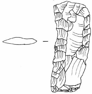 Ritocco piatto, coprente, foliato. Raschiatoio foliato multiplo con margini superiore convesso ed inferiore rettilineo, laterali concavo e convesso, denticolati. Sezione appiattita.