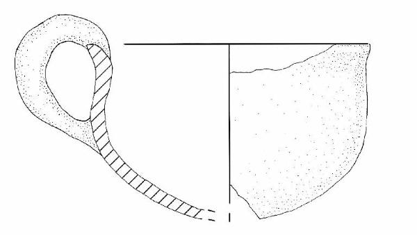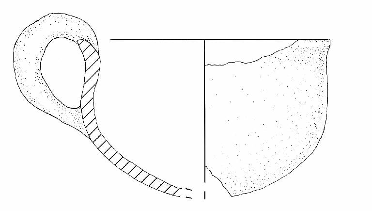 Vasca emisferica con labbro esoverso e orlo esoverso assottigliato. Ansa ad anello impostata sull'orlo e sul diametro massimo