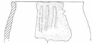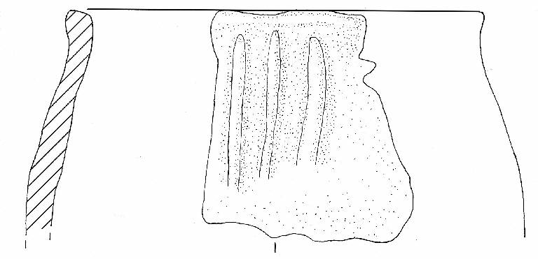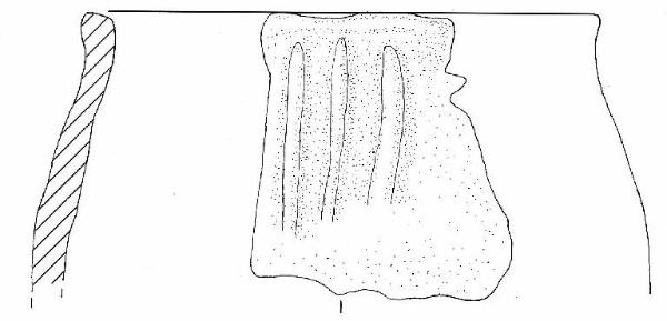 Parete convessa con labbro esoverso e orlo obliquo all'interno, Sotto l'orlo vi sono 3 costolature verticali