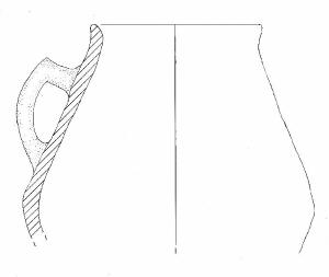 Parete sinuosa con labbro esoverso e orlo esoverso piatto, ansa a gomito con sezione a nastro inpostata tra orlo e diametro massimo
