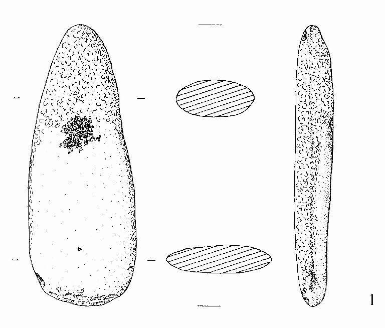 La picchiettatura su una faccia copre un terzo della superficie, mentre sull'altra copre integralmente la superficie; lateralmente scende fino al taglio, che risulta arrotondato e scheggiato. trapezoidale con il tallone arrotondato, i margini poco svasati e il taglio breve, leggermente arcuato. È di poco spessore soprattutto nella parte distale. Al centro di una faccia e nella zona del taglio reca picchiettature.