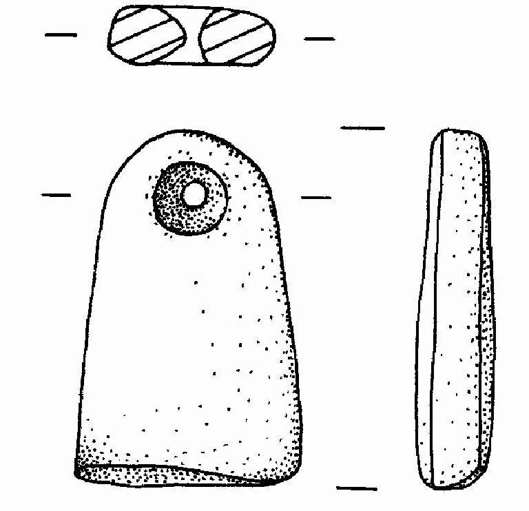 A piastrina sub-trapezoidale, di siltite quarzosa, levigata, con il margine superiore arrotondato e il foro passante con sezione a clessidra. Il margine inferiore è appiattito tramite levigatura.