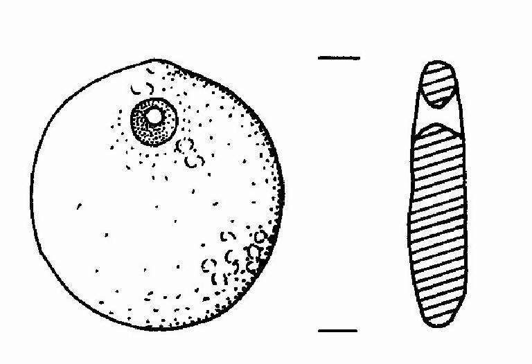 Discoidale, con superficie lisciata, foro passante con sezione a clessidra, decentrato, in corrispondenza di una lieve protuberanza del margine. Con tracce di lievi picchiettature.