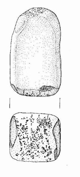 A forma di parallelepipedo, con la base appiattita e la faccia superiore arrotondata; le facce laterali sono appiattite. Sezione subquadrangolare. Picchiettature grossolane sono visibili sul margine superiore, mentre sulla base le picchiettature sono millimetriche.