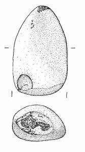 Profilo sub-triangolare con vertice arrotondato e sezione piano-convessa. La base è leggermente appiattita e reca picchiettature di varie dimensioni. Al vertice compaiono picchiettature più grossolane.