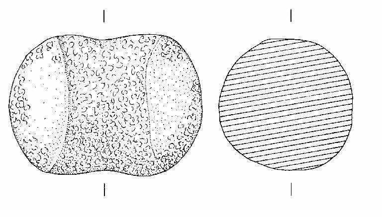 Ciottolo con profilo ovale e ampia solcatura mediana. Le due calotte sono lavorate al fine di rendere simmetrica la forma.