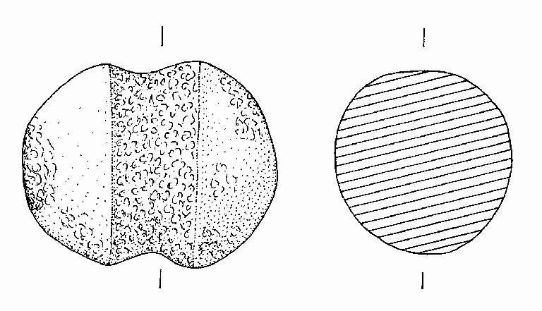Ciottolo con profilo ovale e solcatura mediana, ottenuta con fine picchiettatura. Le due calotte sono lavorate al fine di rendere simmetrica la forma