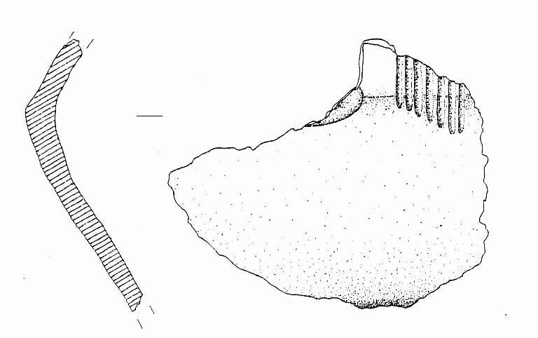 Parete articolata decorata da una banda di sei solcature e forse da una bugna, parzialmente conservata
