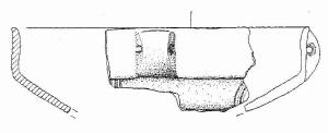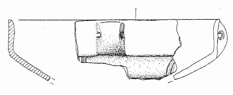 Orlo leggermente esoverso e assottigliato parete alta, verticale e rettilinea. Vasca poco profonda troncoconica decorata da 2 fasci di solcature. Ansa verticale canaliculata impostata tra orlo e carena.