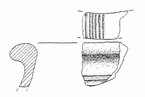 Orlo a tesa arrotondato decorato da solcature trasversali e parete estroflessa decorata da solcature orizzontali.