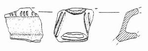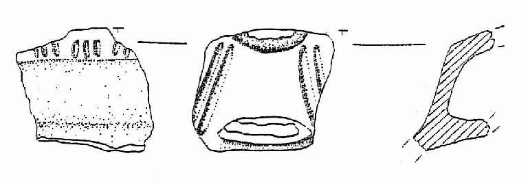 Parete svasata rettilinea decorata all'interno da 3 gruppi di brevi solcature che formano un motivo metopale; all'esterno due gruppi di solcature oblique ai lati dell'ansa. L'ansa nastriforme si impostava sulla carena e sull'orlo.