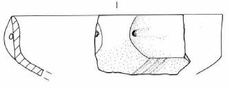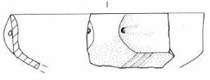 Orlo arrotondato, assottigliato. Parete superiore rettilinea con ansa canaliculata. Vasca troncoconica decorata con un fascio obliquo di tre sottili solcature che parte dalla carena a spigolo vivo.