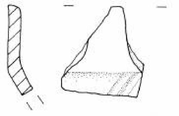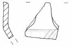 Parete superiore rettilinea. Orlo piatto leggermente esoverso. Carena a spigolo vivo e vasca troncoconica decorata con un fascio di solcature oblique.