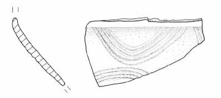 Piccola porzione di parete superiore. Carena e vasca troncoconica decorata con un fascio di quattro solcature parallele disposte a festone sotto la carena e due solcature parallele a semicerchio nella parte inferiore.