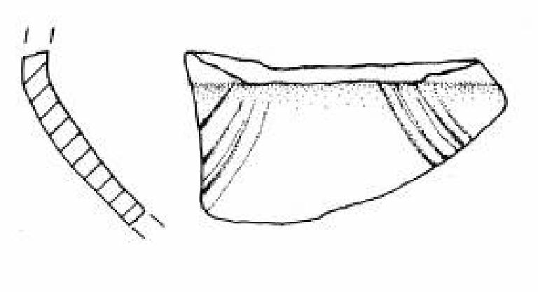 Piccola porzione di parete superiore. Carena e vasca emisferica decorata da due fasci di tre solcature disposti a festone sotto la carena.
