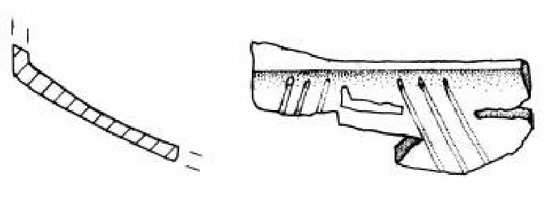 Quattro frammenti con piccola porzione di parete superiore. Carena e vasca troncoconica decorata da due fasci di tre sottili solcature oblique.