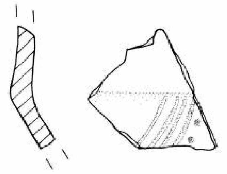 Parete superiore a profilo concavo. Carena a spigolo vivo e vasca troncoconica decorata da un fascio di quattro sottili solcature disposte a festone sotto la carena con a lato due coppelle.