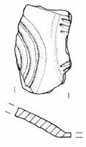 Piccola porzione di fondo piatto decorato con fasci di tre sottili solcature disposte probabilmente a croce e vasca troncoconica decorata da un fascio di tre larghe solcature disposte a festone sotto la carena.