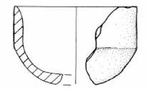 Orlo arrotondato, assottigliato. Parete superiore rettilinea. Carena a spigolo vivo. Vasca emisferica e piccola porzione di fondo.
