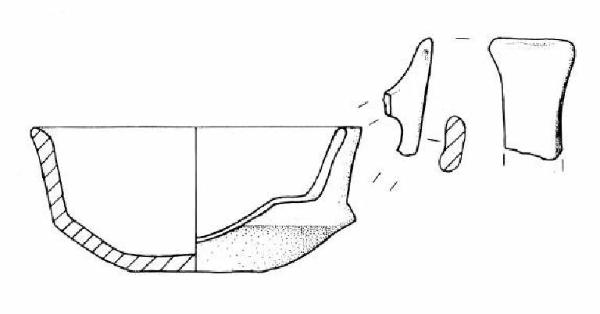 Dieci frammenti con orlo arrotondato esoverso. Parete superiore svasata. Carena a spigolo vivo. Vasca emisferica e fondo piatto. Ansa ad ascia con taglio rettilineo leggermente espanso.