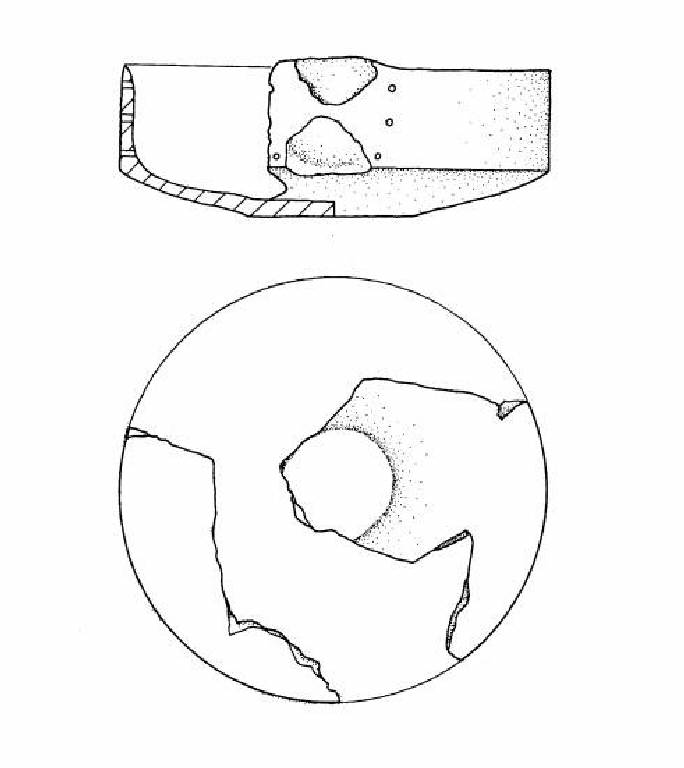 Sei frammenti con orlo arrotondato assottigliato, parete superiore rettilinea con tre fori passanti ai lati degli attacchi dell'ansa. Carena a spigolo vivo. Vasca troncoconica e fondo ombelicato.