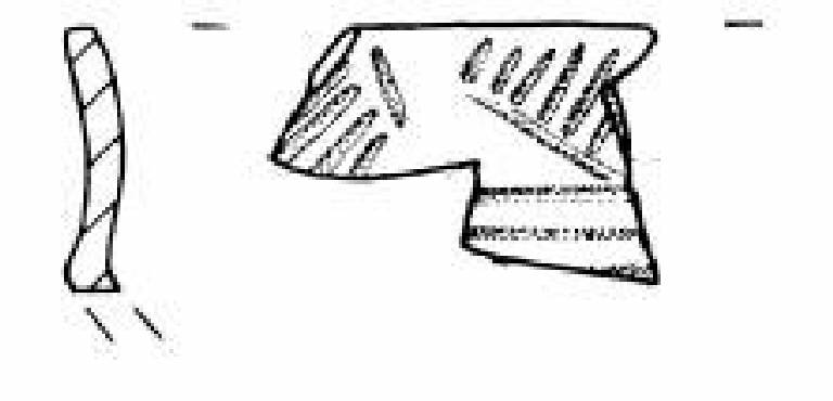 Due frammenti con orlo piatto. Parete superiore a profilo concavo decorata con un fascio di tre sottili solcature orizzontali sopra la carena su cui poggia una teoria di denti di lupo a vertici opposti campiti con solcature oblique.