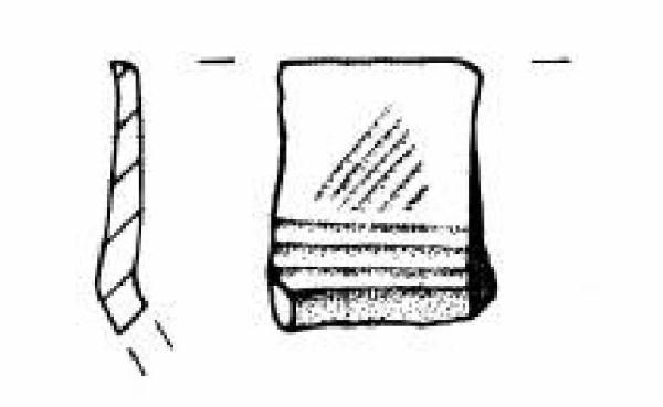 Orlo piatto leggermente esoverso. Parete superiore rettilinea decorata con un fascio di tre sottili solcature orizzontali su cui poggia un dente di lupo formato da solcature oblique. Carena a spigolo vivo.