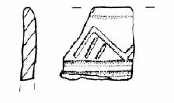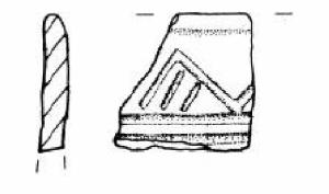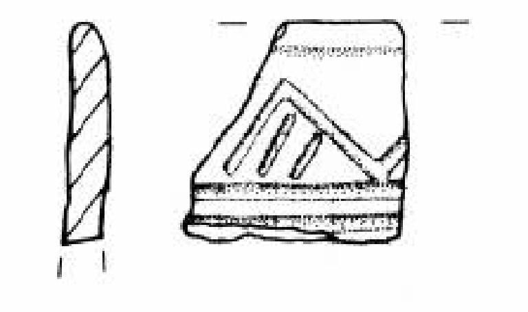 Orlo arrotondato leggermente esoverso. Parete superiore rettilinea decorata con un fascio di solcature orizzontali su cui poggia una teoria di denti di lupo campiti da solcature oblique.