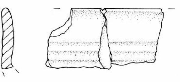 Due frammenti con orlo arrotondato. Parete superiore rettilinea decorata con un fascio di tre larghe solcature orizzontali.