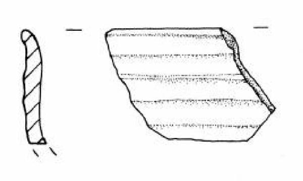 Orlo arrotondato, assottigliato, esoverso. Parete superiore rettilinea decorata con un fascio di larghe solcature orizzontali.