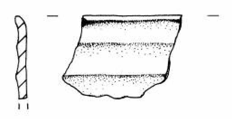 Orlo arrotondato esoverso. Parete superiore rettilinea decorata con un fascio larghe solcature a spigolo vivo orizzontali.