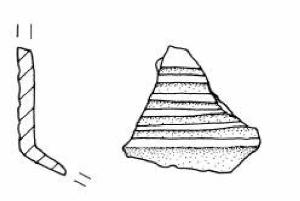Parete superiore rettilinea decorata con un fascio di cinque solcature orizzontali. Carena a spigolo vivo e vasca troncoconica.